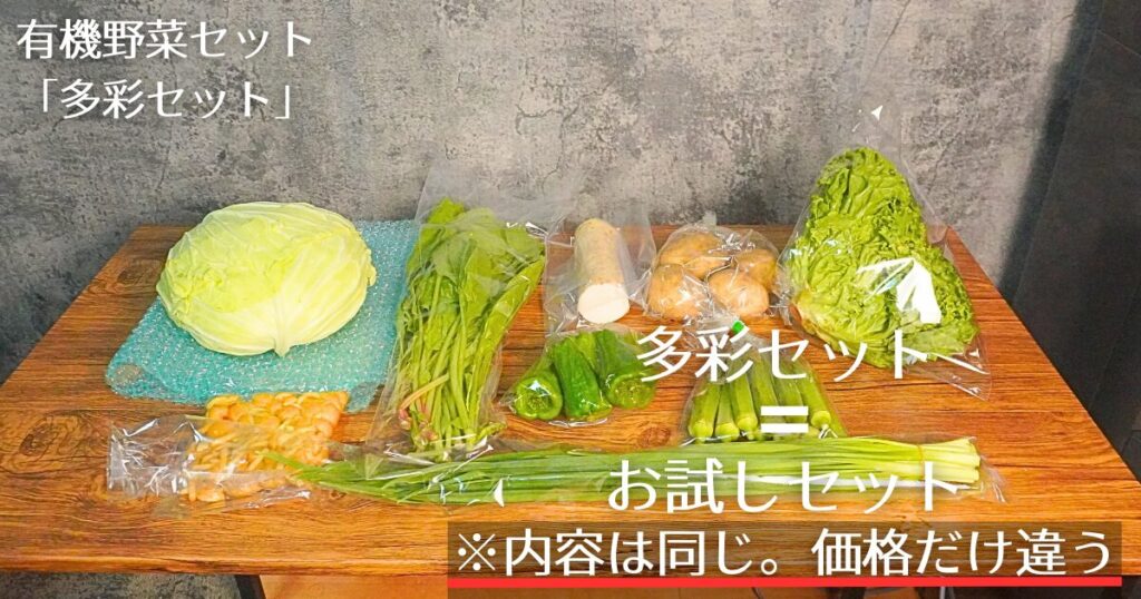 お試しセットの内容は、定期宅配サービスの1つ「有機野菜セット」の多彩セットです。