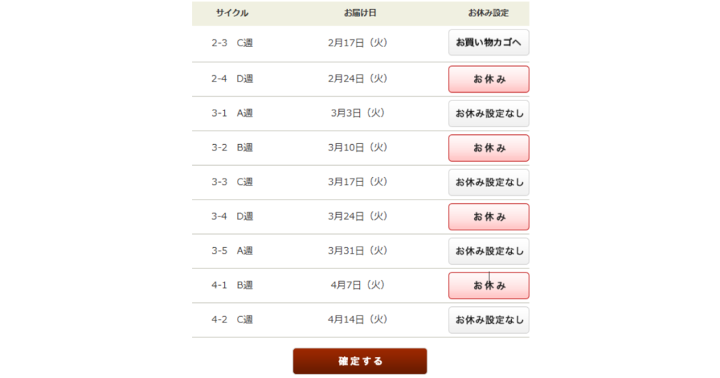 毎週・隔週・3週間に1回・月に1回と、お届けサイクルを固定することもできます。